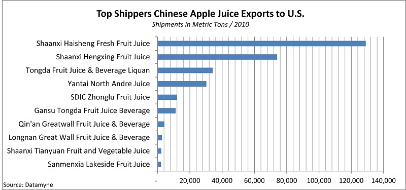 We turned to the Datamyne bill-of-lading database to identify the top players in the trade, including top shippers, consignees, and carriers. You can see the top 10 companies shipping apple juice from China to the US below. We also looked up leading shippers in Brazil, Argentina, and Chile, countries that rank next (albeit distantly) after China as sources for US apple juice imports. If you’d like to see how much you can learn about who’s selling and buying Chinese apple juice (or any other import) in the US, we’d be happy to show you, just ask us for a (free) demo.