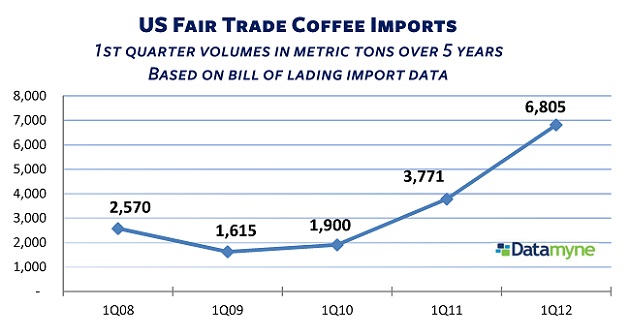 Datamyne US import data, based on bills of lading documenting incoming shipments, indicates that 2012 is on its way to setting new records for fair trade coffee, with first-quarter volume up 55% compared to the same period in 2011.