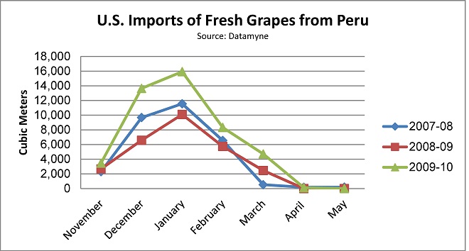 Peru’s share of the U.S. market is still very small: in 2009, it claimed a bit over 2%, compared to Mexico’s 19% and Chile’s 78%. But Peru increased shipments to the U.S. 25% last year and 30% the year before as it positioned itself as a reliable alternative source for grapes (to which buyers were able to turn last year when an early freeze damaged Chile’s harvest).