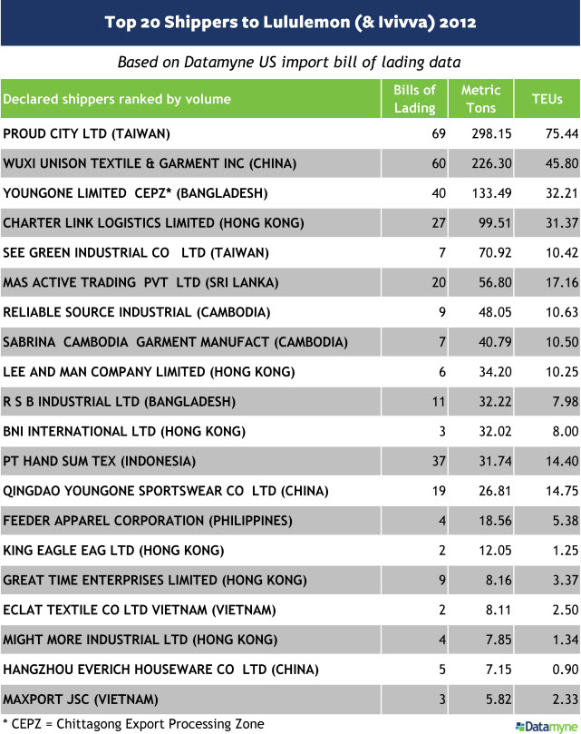 Lululemon is reviewing its overseas supply chain to figure out what went wrong. The company acknowledges (in its 10-Q) the risk of having limited control over a limited number of third-party suppliers, under short-term contracts, that provide all the fabrics for and make all its apparel. (See the table below for the top 20 shippers of product – primarily finished apparel – to Lululemon and its girls’ brand Ivivva in the US in 2012.)