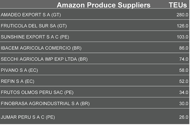 With the Datamyne Profiles feature we were able to drill down still further for details about the consignees. We found, for instance, this list of suppliers of top-ranked US importer, Amazon Produce Network (note that these are suppliers for all imported produce during the rolling year from April 2011 through May 2012).