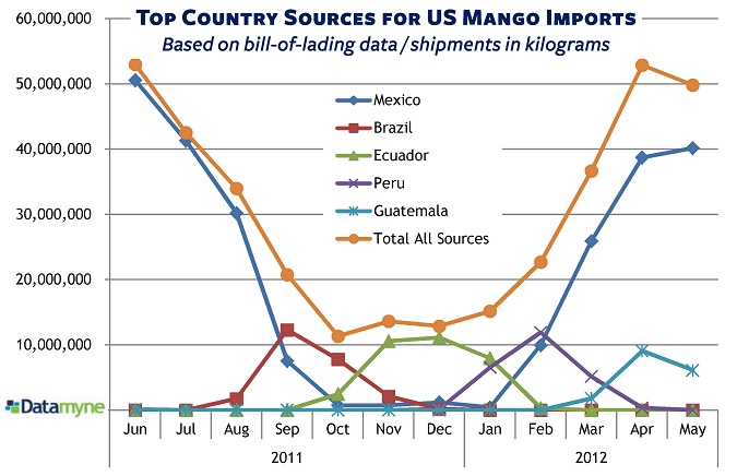 With US domestic production of mangoes pretty much limited to southern Florida, more than 90% of the fruit consumed here is imported. Mexico is far and away the top source, exporting 247,394,904 kilograms June 2011 through May 2012, but its peak season runs from March to August. As Fall begins in the north, shipments from Mexico slow and trade from south of the equator picks up.