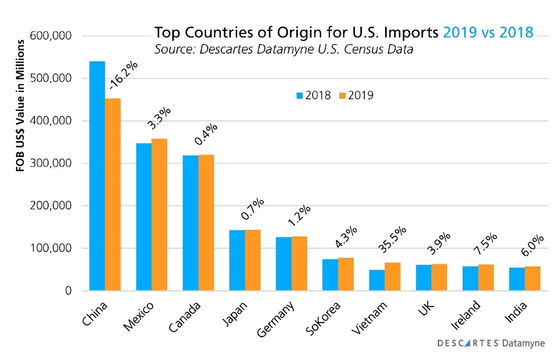 Vietnam saw a big gain of 35.5% in the value of imports shipped to the U.S. in 2019 compared with the preceding year. Vietnam also vaulted to No. 7 in 2019, up from the previous year’s ranking as No. 12 among U.S. sources for imports.