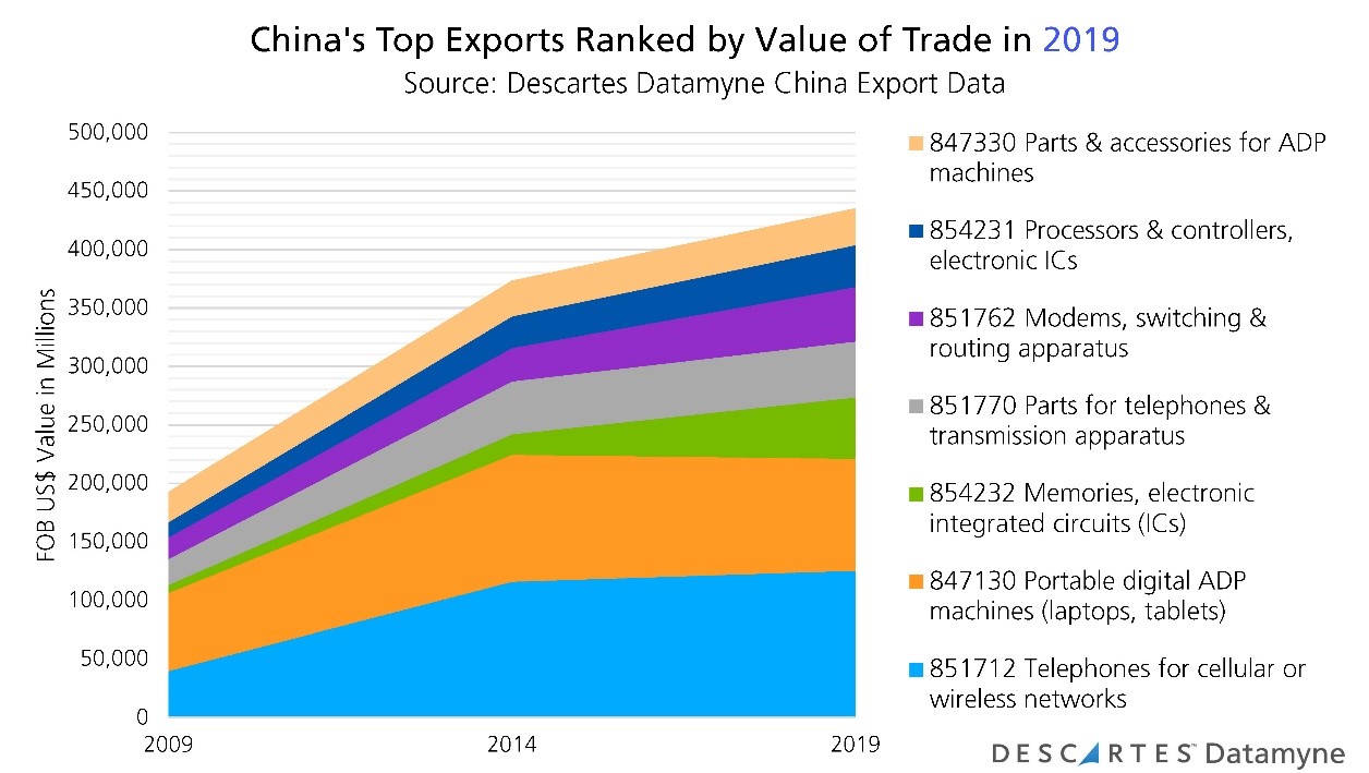 Our China data provides one measure of the success of the “Made in China 2025” strategy implemented in 2015. As of 2019, China’s top exports were dominated by electronics: