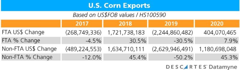 Narrowing the focus to the subject of one of the USITC report’s case studies, the importance of FTA partners to U.S. exporters of corn is clear: