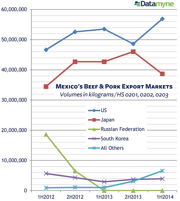 The US is being urged to drop its country-of-origin labeling requirement for imported meat and livestock following the World Trade Organization’s decision in favor of the Canadian and Mexican case against the COOL rule that took effect in 2013 – and before Canada and Mexico impose retaliatory tariffs. Mexico and Canada are top destinations for US meat exports – as the US is for Mexican and Canadian meats (see the graphs below).