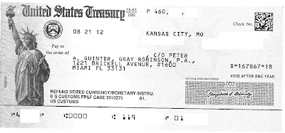 Below is a picture of a United States Treasury check. Not just any check, but a check payable to a client whose money was seized by US Customs and Border Protection (CBP) and Immigration and Customs Enforcement (ICE) officials of the US Department of Homeland Security.