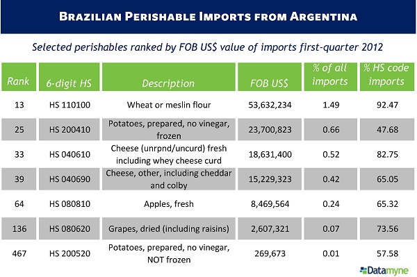 We took a look at our data on first-quarter trade in some of the perishables mentioned by Reuters (see the table below). Clearly, these products represent a small slice of Brazilian import trade – but within each product category, Argentina is a leading, if not the primary, source.